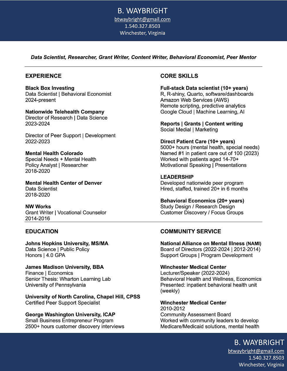 My name is B. I have more than 20 years cross-trained experience working in behavioral health care, program development, data science and research, public policy and behavioral economics, grant writing and marketing and direct patient care.